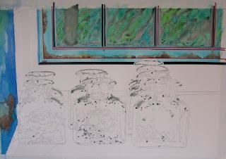 I then began adding in color. This photo represents about 3 layers of color. These DPM inks aren’t as vivid as I thought they would be, or else I’m watering them down too much. Like I said, this is all new to me so if the painting turns out well, great, but if not, it was a learning experience.